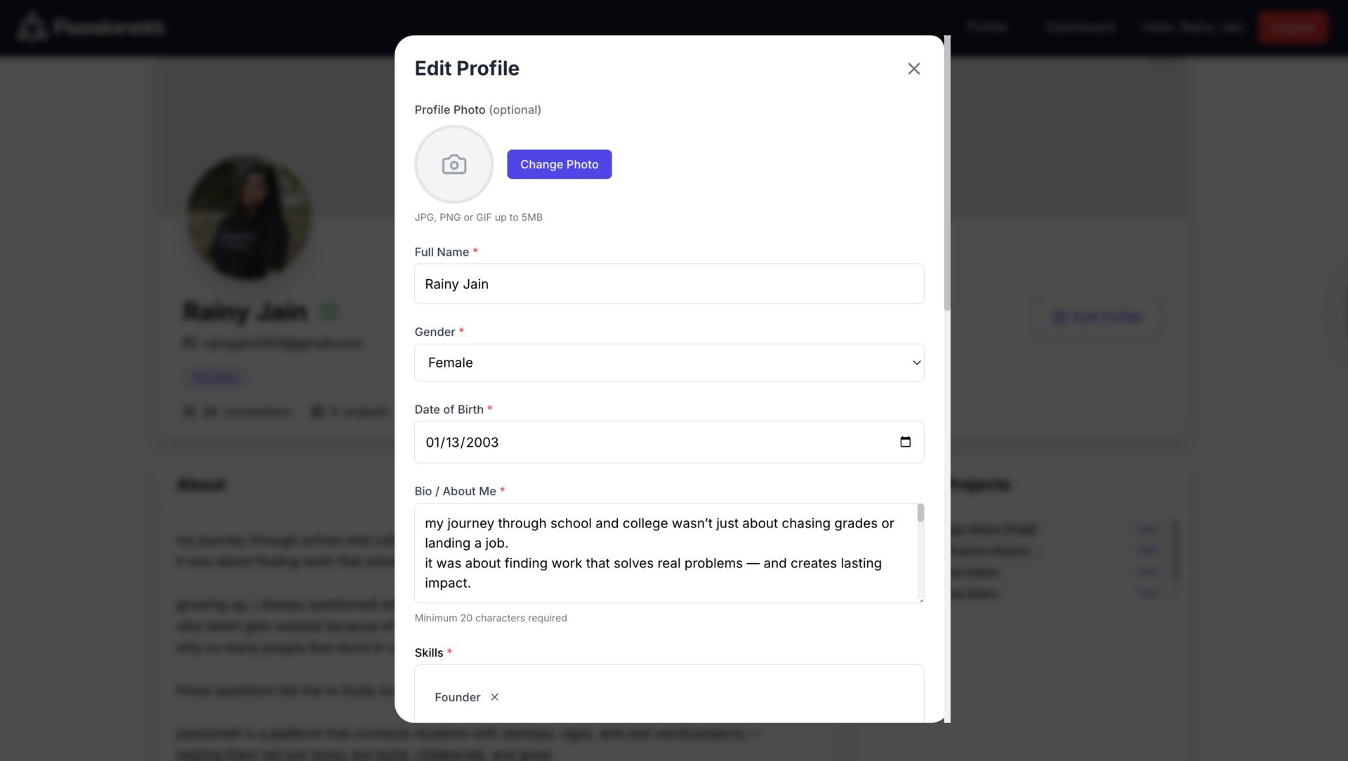 → Add LinkedIn, GitHub, Behance, or any portfolio link. This helps recruiters and peers see your work beyond Passionett.